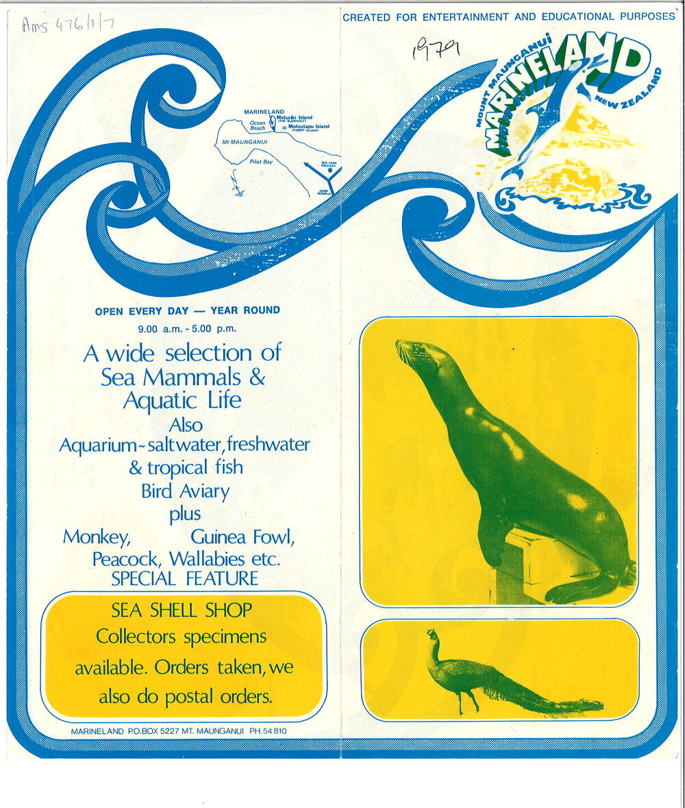 Mount Maunganui Marineland New Zealand, Mount Maunganui Marineland flier (1979). Pae Korokī, accessed 18/03/2026, https://paekoroki.tauranga.govt.nz/nodes/view/114237
