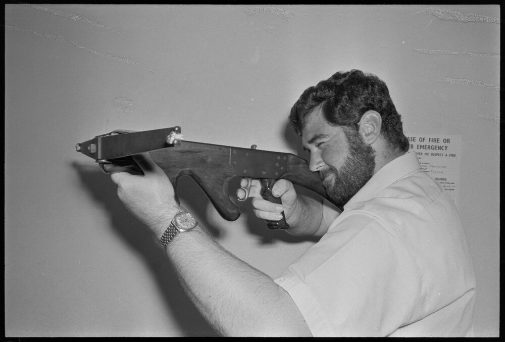 Date11 December 1973Reference Numberphoto gcc-30806DescriptionNeal Niederer, 19, student at Tauranga Boy's High School, is pictured sighting up the crossbow he built for this year's Form VI technical drawing project. Published 11 December 1973.FormatNegativePhysical Description35mm black-and-white negative (2/3)Photographer/CreatorBay of Plenty Times