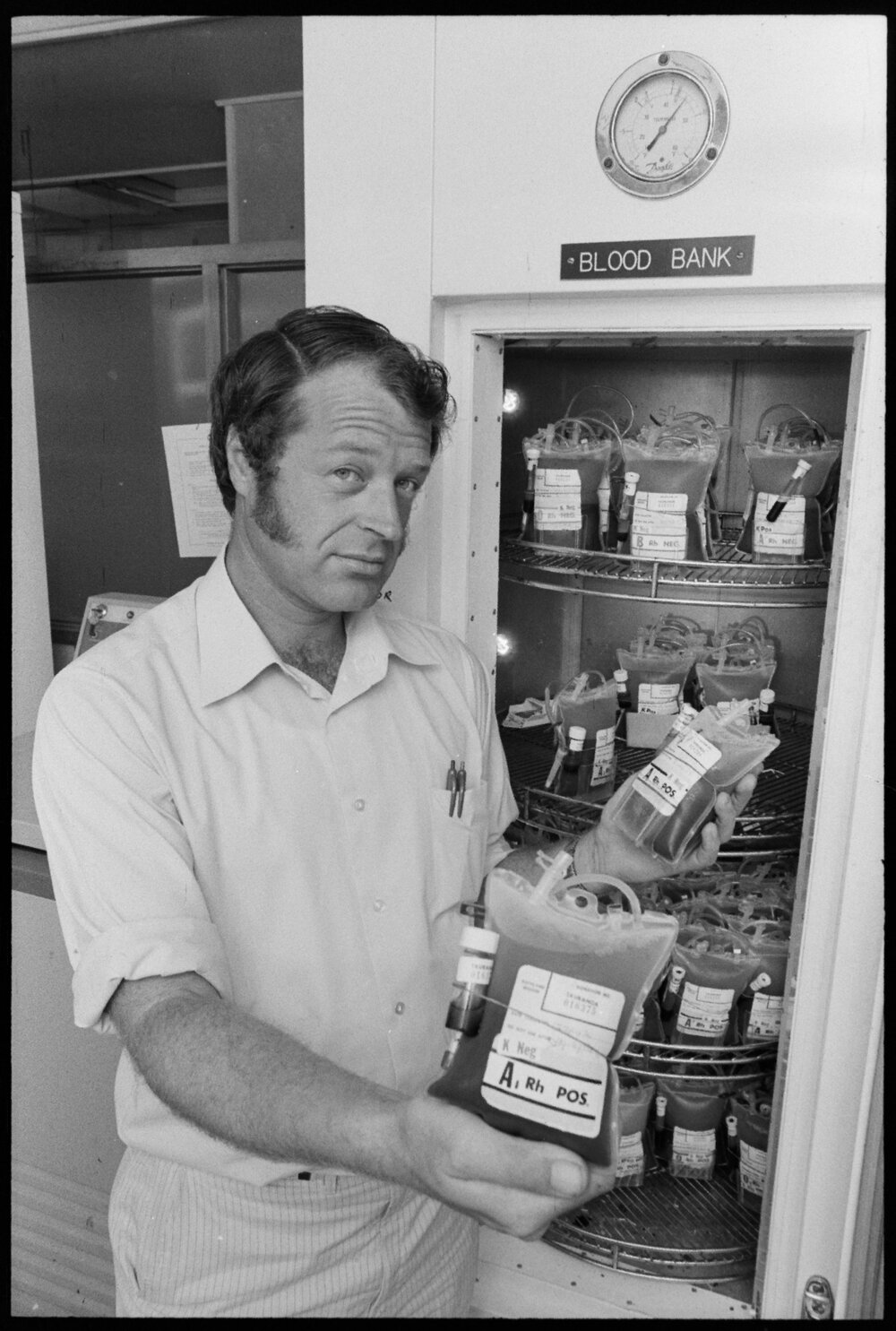 Date4 December 1974Reference Numberphoto gcc-30859DescriptionMost types of blood are in short supply at the Tauranga Hospital blood bank. Blood transfusion technician Mr M. Flack shows units of a type that has been in heavy demand ahead of a re-stocking campaign. Published 4 December 1974.FormatNegativePhysical Description35mm black-and-white negative (1/3)Photographer/CreatorBay of Plenty Times