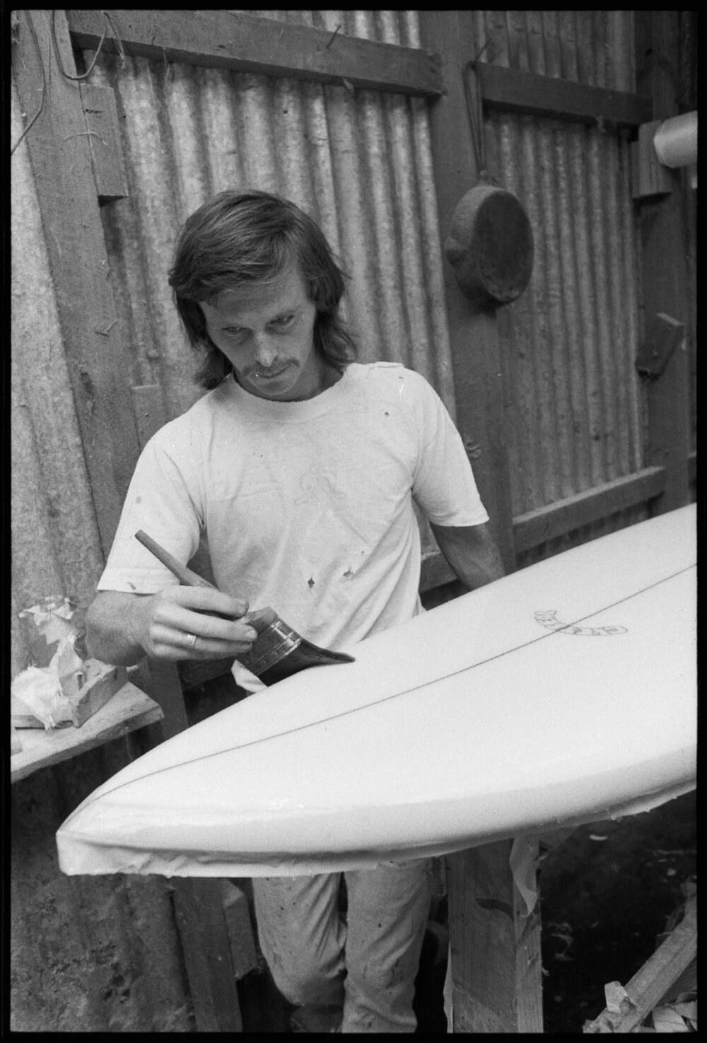 Date5 December 1974Reference Numberphoto gcc-30887DescriptionTony Waterhouse applies fibreglass resin to a surfboard, at the company he runs with Hamish Aitken and Neville Hill, Greyseal Ltd in Welcome Bay. Published 5 December 1974.FormatNegativePhysical Description35mm black-and-white negative (3/9)Photographer/CreatorBay of Plenty Times