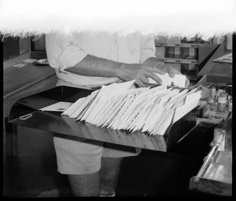 Date5 December 1974Reference Numberphoto gcc-30894DescriptionObscured photo of a man sorting through a tray of mail. 5 December 1974.FormatNegativePhysical Description35mm black-and-white negative (1/5)Photographer/CreatorBay of Plenty Times