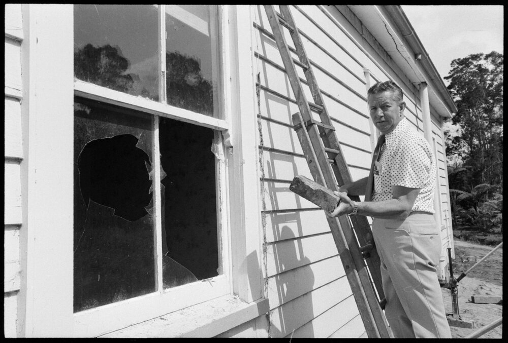Date6 December 1974Reference Numberphoto gcc-30928DescriptionMuseum committee chairman, Mr N. W. Nicholls holding the brick which shattered one of the windows in one of the buildings at the Tauranga District Museum's historic village. Published 6 December 1974.FormatNegativePhysical Description35mm black-and-white negative (3/9)Photographer/CreatorBay of Plenty Times