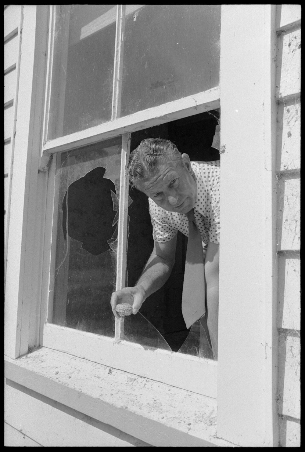 Date6 December 1974Reference Numberphoto gcc-30929DescriptionMuseum committee chairman, Mr N. W. Nicholls holding the brick which shattered one of the windows in one of the buildings at the Tauranga District Museum's historic village. Published 6 December 1974.FormatNegativePhysical Description35mm black-and-white negative (4/9)Photographer/CreatorBay of Plenty Times