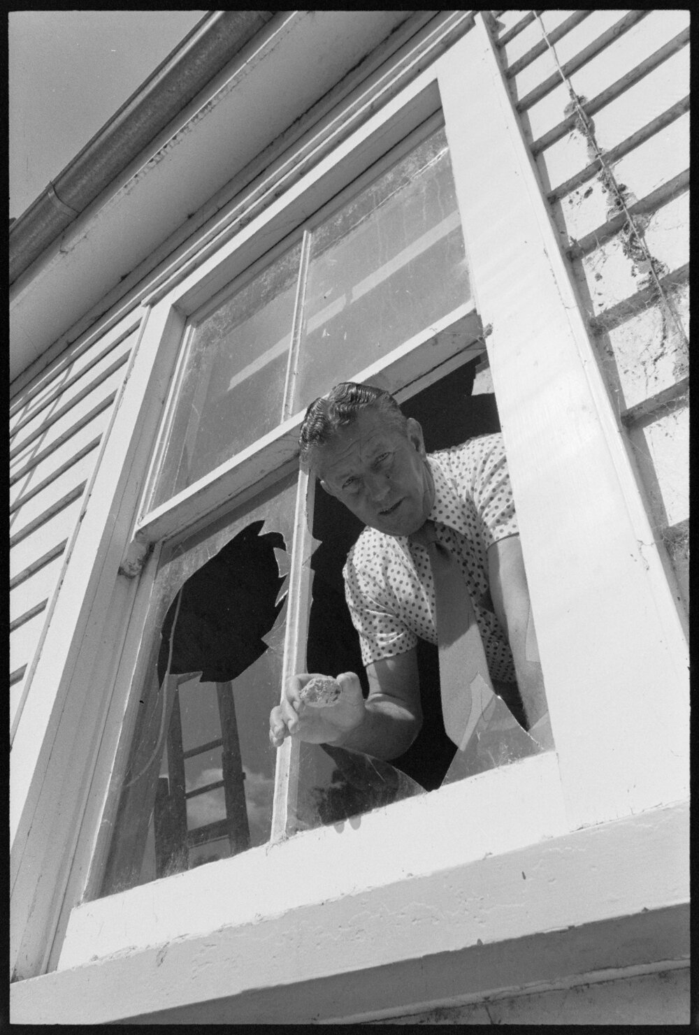 Date6 December 1974Reference Numberphoto gcc-30934DescriptionMuseum committee chairman, Mr N. W. Nicholls holding the brick which shattered one of the windows in one of the buildings at the Tauranga District Museum's historic village. Published 6 December 1974.FormatNegativePhysical Description35mm black-and-white negative (9/9)Photographer/CreatorBay of Plenty Times