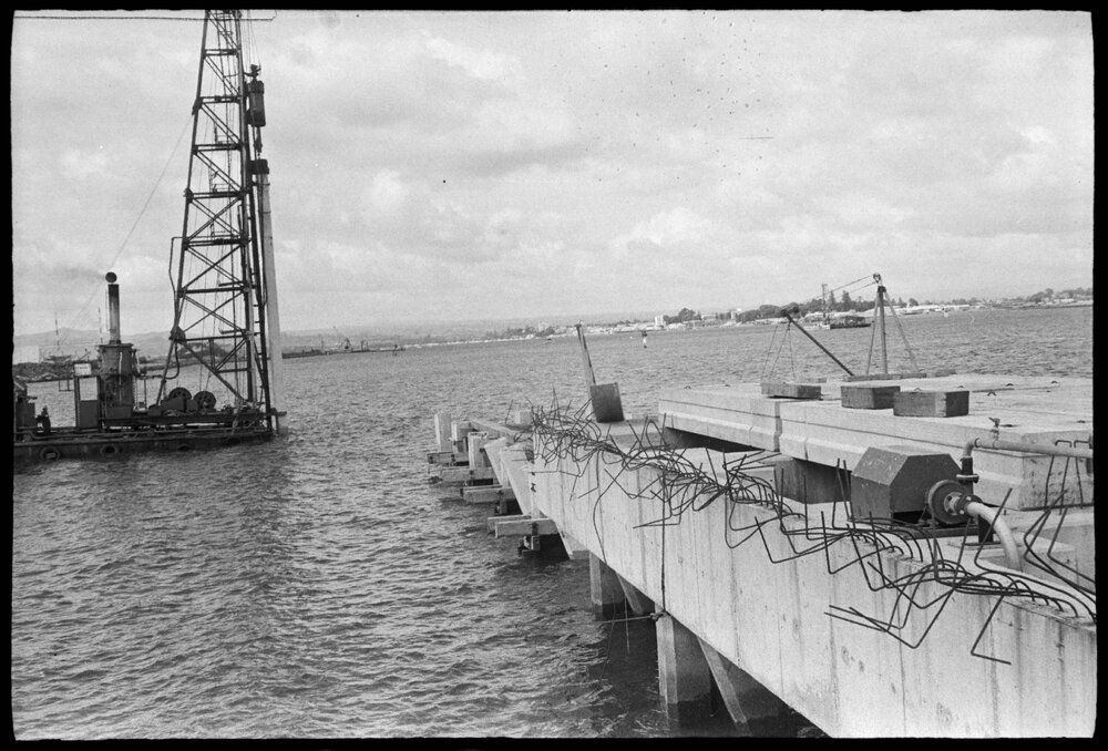 Date7 December 1974Reference Numberphoto gcc-30936DescriptionBay of Plenty Harbour Board's construction of the number nine wharf extension. Designed for the heaviest and most up-to-date cargo handling operations this $1.38 million project add's a further 300 feet to the wharf at Mount Maunganui. Published 7 December 1974.FormatNegativePhysical Description35mm black-and-white negative (2/3)Photographer/CreatorBay of Plenty Times