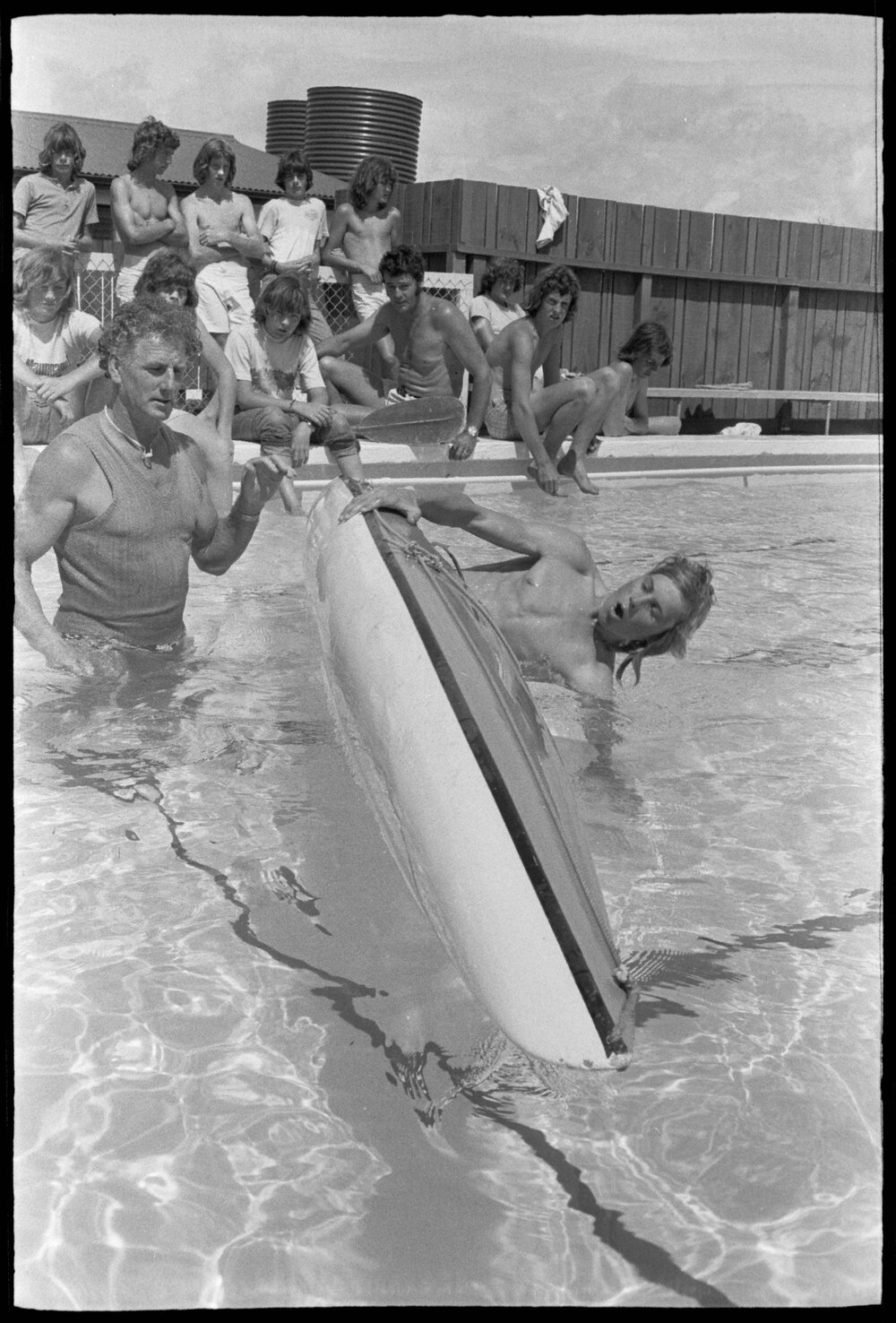 Date7 December 1974Reference Numberphoto gcc-30942DescriptionHaving spent five seconds upside-down in a canoe, Stephen Weidmann is helped into a headhair position by canoeist Mr Bill Ross, at Mount Maunganui. Stephen, 15, is among a group of Tauranga Boys College fourth form pupils learning about surf life-saving and rescue this week at the annual Surf Life Saving Camp organised by the president of the Ōmanu Pacific Life Saving Club, Mr Dave Franklin. Published 7 December 1974.FormatNegativePhysical Description35mm black-and-white negative (5/6)Photographer/CreatorBay of Plenty Times