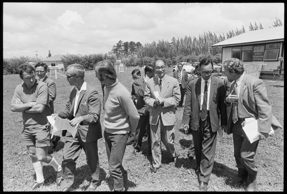 Date10 December 1974Reference Numberphoto gcc-31008DescriptionMembers of a Chinese delegation listen to the manager of the DSIR sub-tropical fruit research station, Mr. R.G Lowe, explain methods of cultivating commercial kiwifruit vines. Published 10 December 1974.FormatNegativePhysical Description35mm black-and-white negative (1/3)Photographer/CreatorBay of Plenty Times