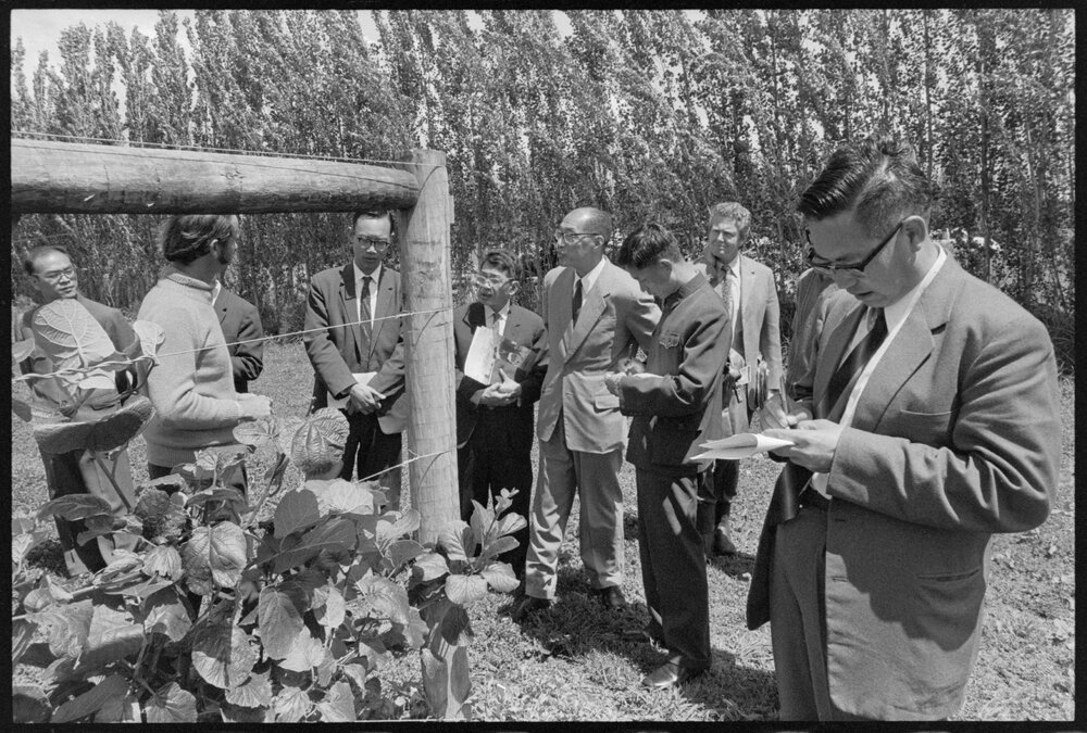 Date10 December 1974Reference Numberphoto gcc-31009DescriptionMembers of a Chinese delegation listen to the manager of the DSIR sub-tropical fruit research station, Mr. R.G Lowe, explain methods of cultivating commercial kiwifruit vines. Published 10 December 1974.FormatNegativePhysical Description35mm black-and-white negative (2/3)Photographer/CreatorBay of Plenty Times