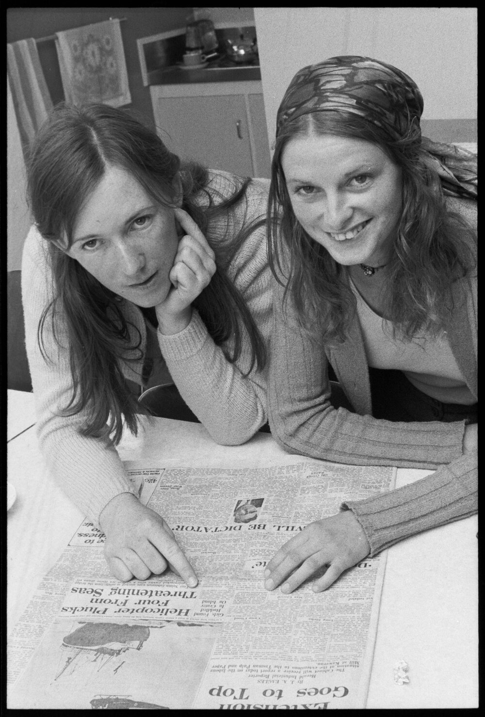 Date10 December 1974Reference Numberphoto gcc-31017DescriptionTired but well after a night lost on Tūhua, Mayor Island are two Thames nurses, Naomi Gower (left) and Lammina Ruijne. Published 10 December 1974.FormatNegativePhysical Description35mm black-and-white negative (1/6)Photographer/CreatorBay of Plenty Times