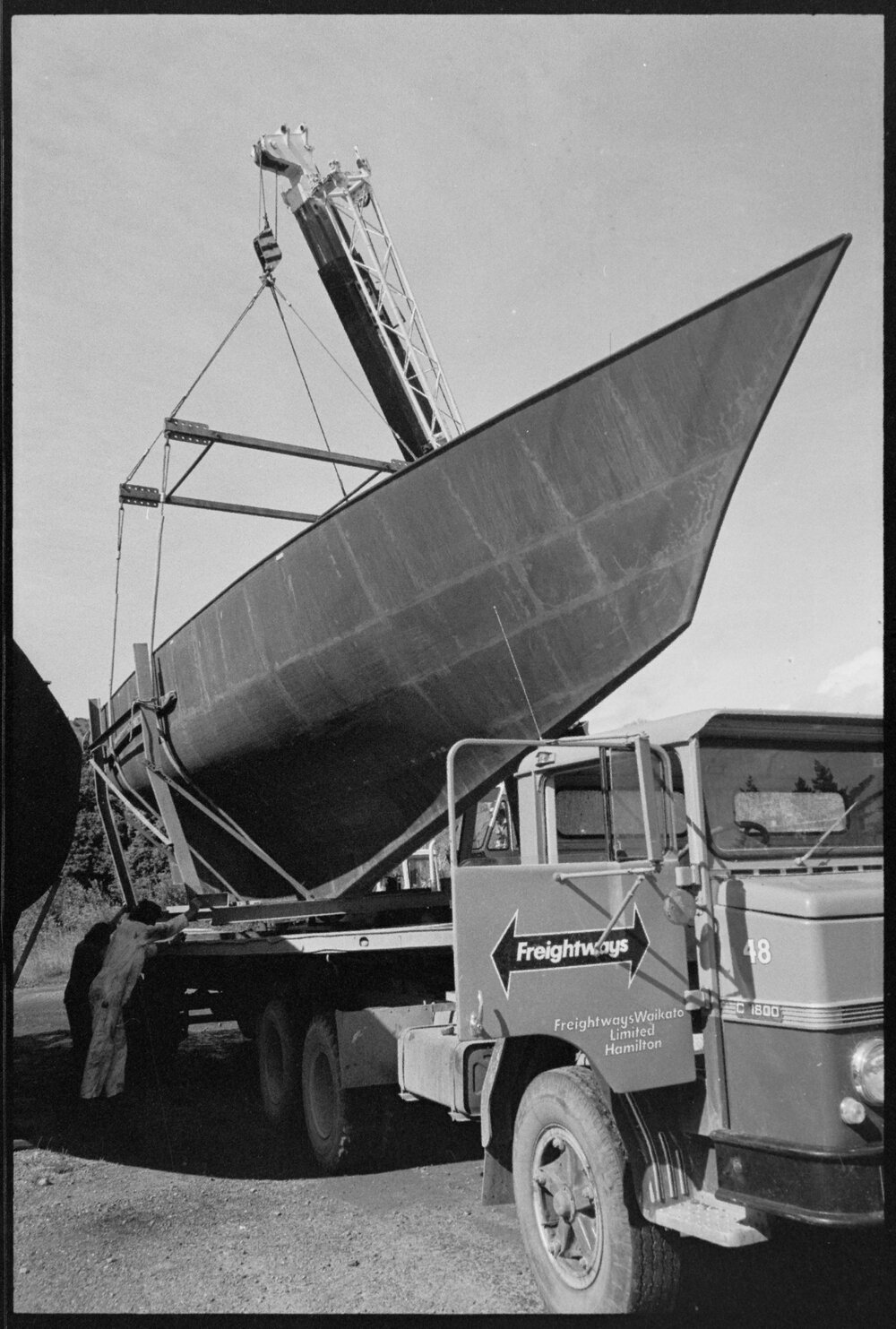 Date10 December 1974Reference Numberphoto gcc-31023DescriptionA six ton steel hull Herreshoff yacht remained steady on its long trip to Hamilton from Pāpāmoa where it was built by Messrs Ashmore and Braid. Published 10 December 1974.FormatNegativePhysical Description35mm black-and-white negative (1/6)Photographer/CreatorBay of Plenty Times