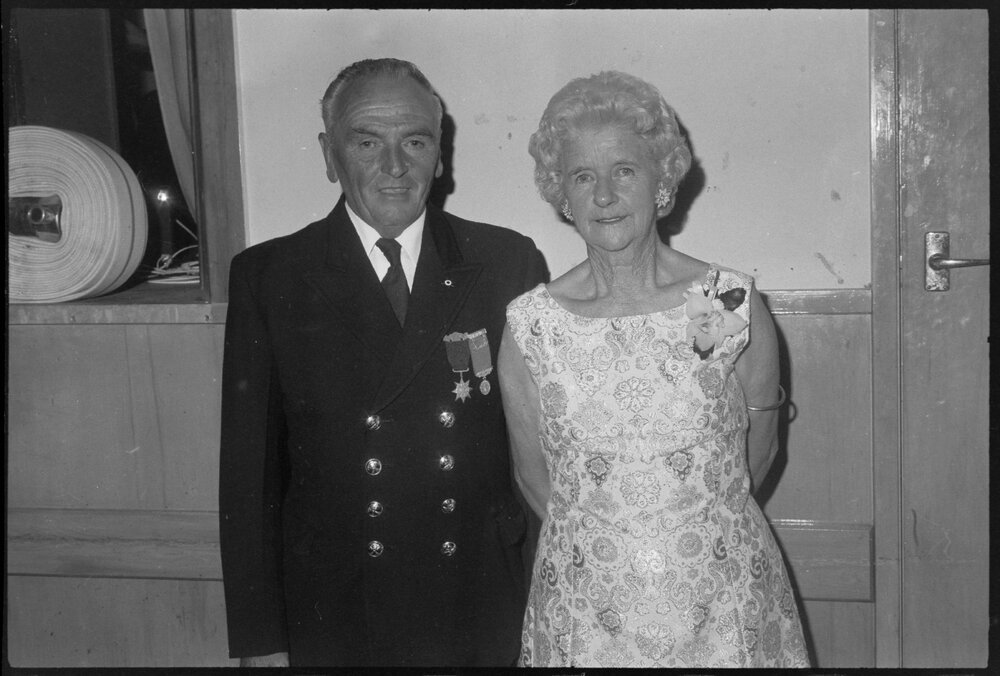 Date10 December 1974Reference Numberphoto gcc-31032DescriptionAwarded the Gold Star is Sub-Officer David Seath, with his wife, Jessie, of the Waihī Volunteer Fire Brigade, for his service. Published 10 December 1974.FormatNegativePhysical Description35mm black-and-white negative (1/2)Photographer/CreatorBay of Plenty Times