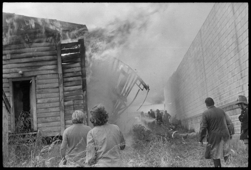 Date11 December 1974Reference Numberphoto gcc-31060DescriptionA wall of one of the buildings collapses during the height of the fire in Waihī’s main street which gutted two shops. A disruption to the water supply hindered volunteer firefighters efforts. Published 11 December 1974.FormatNegativePhysical Description35mm black-and-white negative (1/3)Photographer/CreatorBay of Plenty Times