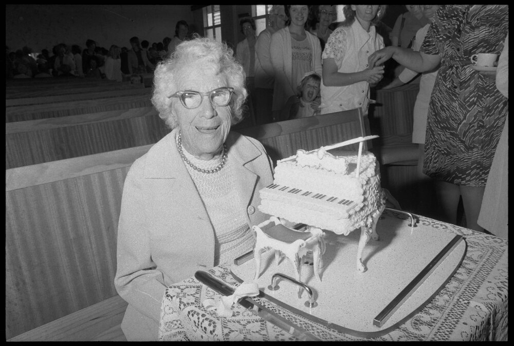 Date12 December 1974Reference Numberphoto gcc-31072DescriptionA cake in the shape of a grand piano was made to celebrate the 95th birthday of Miss E. Parry, of Tauranga, on Tuesday. Miss Parry's birthday coincided with Women's Fellowship Christmas breakup at the Assembly of God Church, Ōtūmoetai. Published 12 December 1974.FormatNegativePhysical Description35mm black-and-white negative (4/6)Photographer/CreatorBay of Plenty Times