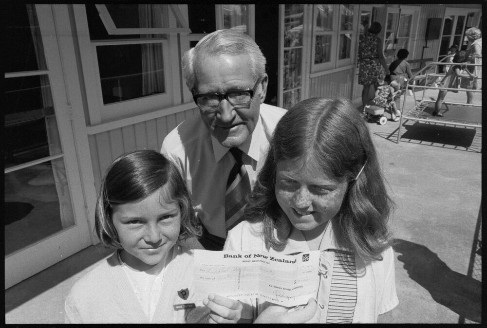Date12 December 1974Reference Numberphoto gcc-31083DescriptionMr T. D. Webster, president of the Crippled Children Society, receives a fundraised cheque, presented by prefects from Ōmanu Primary School, Karen Williams (left) and Donna Mercer. Published 12 December 1974.FormatNegativePhysical Description35mm black-and-white negative (3/6)Photographer/CreatorBay of Plenty Times