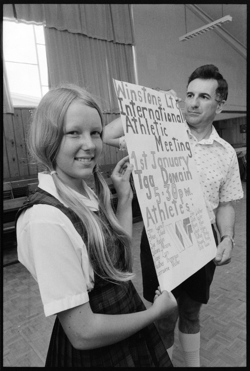 Date12 December 1974Reference Numberphoto gcc-31087Description12 year old Lynette Hardaker and local sports commentator John May hold her winning poster from a competition held at Tauranga Intermediate School to advertise the International athletics meeting in Tauranga. She won free seats for all her classmates. Published 12 December 1974.FormatNegativePhysical Description35mm black-and-white negative (1/3)Photographer/CreatorBay of Plenty Times
