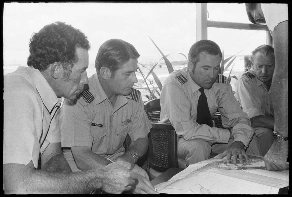 Date12 December 1974Reference Numberphoto gcc-31103DescriptionTauranga Aero Club club captain, Mr Bill Baldwin, discusses the plans for the Royal New Zealand Aero Club's national pageant at Tauranga with Squadron Leaders P. J. McKay (centre) and J. M. Terry, both from Whenuapai. Published 12 December 1974.FormatNegativePhysical Description35mm black-and-white negative (5/6)Photographer/CreatorBay of Plenty Times