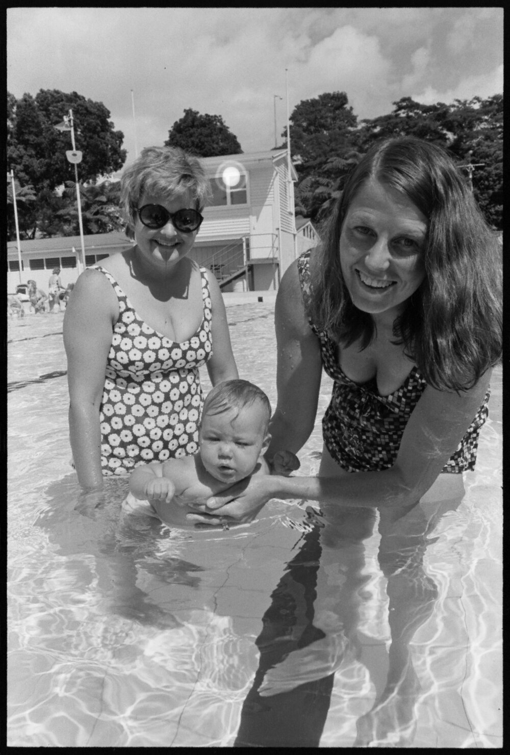 Date12 December 1974Reference Numberphoto gcc-31106DescriptionSix-month-old Sarah Goldstein is in the water with her mother, Mrs Carol Goldstein, at the swimming classes for babies at the Memorial Park pool. At left is instructor, Mrs Anne McLeod. Published 12 December 1974.FormatNegativePhysical Description35mm black-and-white negative (2/6)Photographer/CreatorBay of Plenty Times
