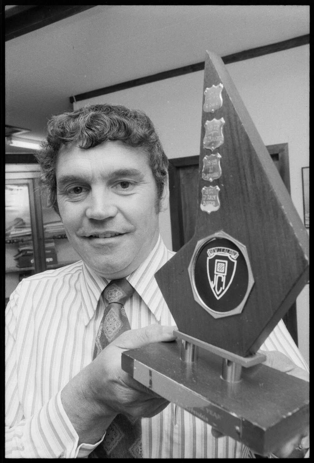 Date13 December 1974Reference Numberphoto gcc-31123DescriptionMr Darcy Baker has been named Jaycee of the Year by the Greerton Jaycees. He was presented with his award at the chapter's recent fourth annual awards dinner. Published 13 December 1974.FormatNegativePhysical Description35mm black-and-white negative (1/9)Photographer/CreatorBay of Plenty Times