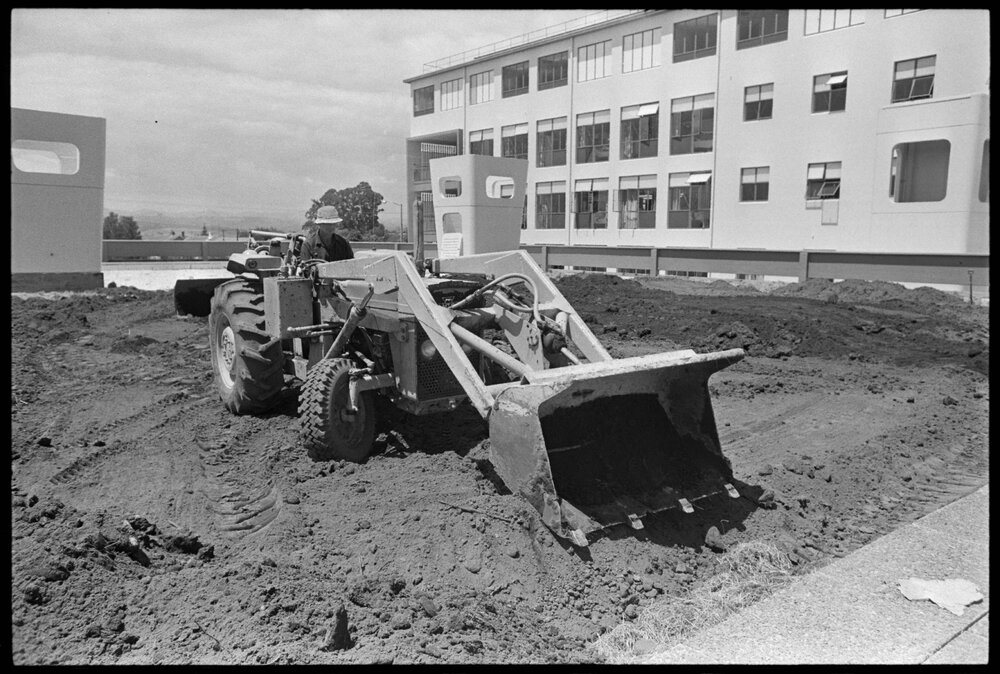 Date14 December 1974Reference Numberphoto gcc-31150DescriptionMr J. Thomas on a tractor at the Tauranga Hospital, creating a multi-purpose garden is taking shape on the roof of the partially completed Clinical Services block. Published 14 December 1974.FormatNegativePhysical Description35mm black-and-white negative (1/6)Photographer/CreatorBay of Plenty Times