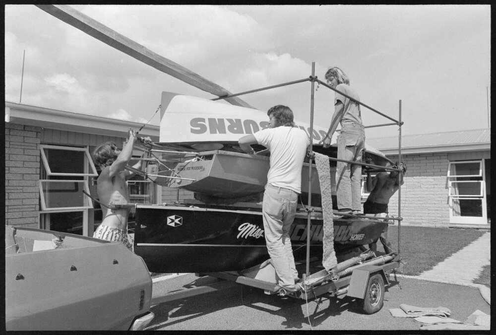 Date16 December 1974Reference Numberphoto gcc-31183DescriptionA special trailer designed to carry three Tauranga 12-foot Q Class yachts on a roll-on roll-off ship to Sydney for the Interdominion series next month was loaded in Tauranga by Laurie Deans (left) and John Laurie. Published 16 December 1974.FormatNegativePhysical Description35mm black-and-white negative (1/6)Photographer/CreatorBay of Plenty Times