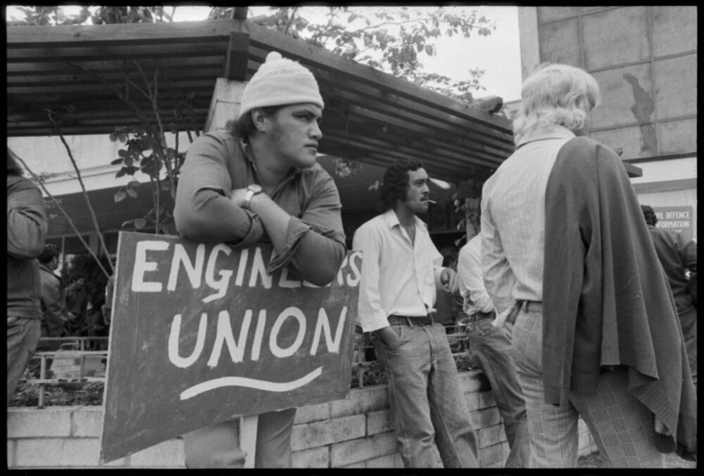 Date16 December 1974Reference Numberphoto gcc-31217DescriptionA rally of 527 workers protest at the municipal offices in Kawerau amid employment issues at Fletcher Construction. Published 16 December 1974.FormatNegativePhysical Description35mm black-and-white negative (12/15)Photographer/CreatorBay of Plenty Times