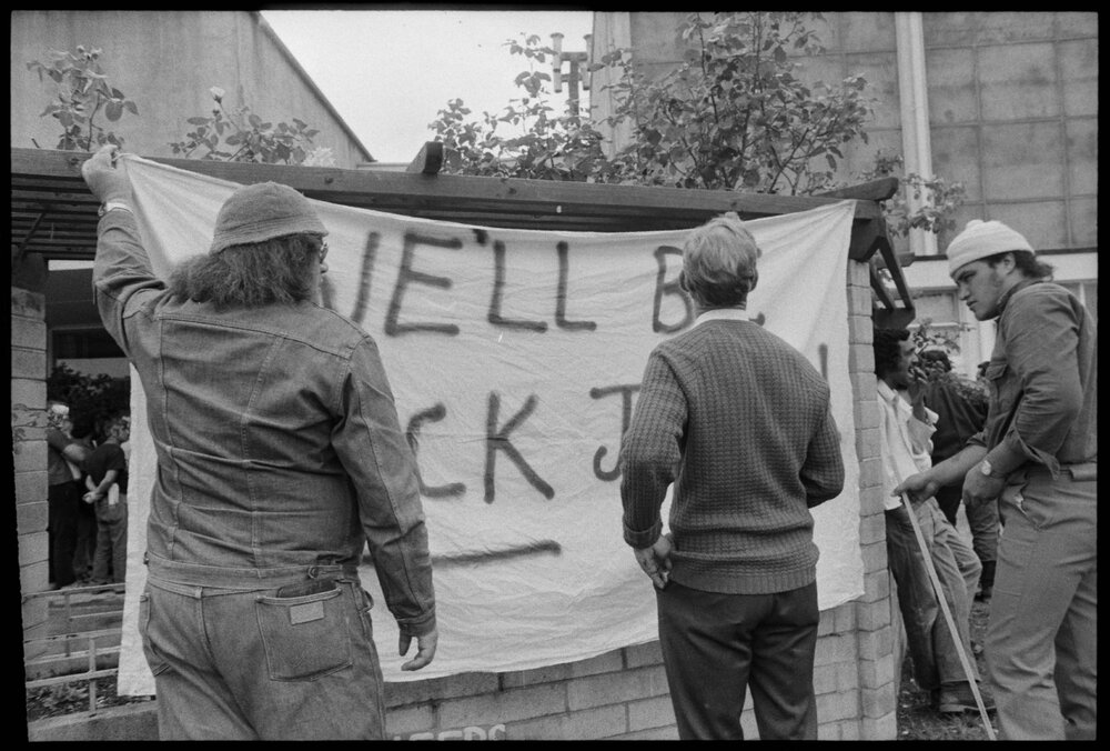 Date16 December 1974Reference Numberphoto gcc-31218DescriptionA rally of 527 workers protest at the municipal offices in Kawerau amid employment issues at Fletcher Construction. Published 16 December 1974.FormatNegativePhysical Description35mm black-and-white negative (13/15)Photographer/CreatorBay of Plenty Times