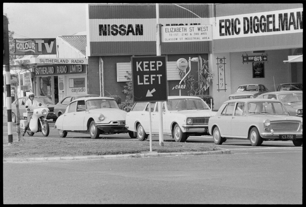 Date18 December 1974Reference Numberphoto gcc-31255DescriptionA new set of traffic lights are in operation at the intersection of Cameron Road and Elizabeth Street. Eric Diggelman's Nissan car dealership appears next to Sutherland Radio Ltd in the background. Published 18 December 1974.FormatNegativePhysical Description35mm black-and-white negative (1/3)Photographer/CreatorBay of Plenty Times