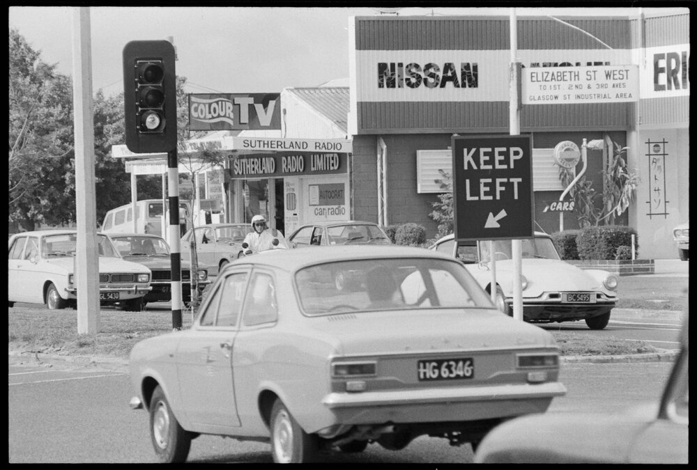 Date18 December 1974Reference Numberphoto gcc-31257DescriptionA new set of traffic lights are in operation at the intersection of Cameron Road and Elizabeth Street. Eric Diggelman's Nissan car dealership appears next to Sutherland Radio Ltd in the background. Published 18 December 1974.FormatNegativePhysical Description35mm black-and-white negative (3/3)Photographer/CreatorBay of Plenty Times
