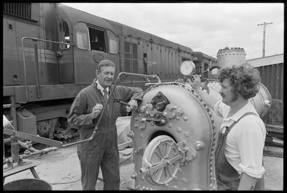 Date19 December 1974Reference Numberphoto gcc-31295DescriptionMr Kidd (left) from the Marine Division of the Ministry of Transport next to the train's boiler as Mr Jones pumps water into it. They have been restoring the 100 year old train for its return to service at the district museum at the Historic Village. Published 19 December 1974.FormatNegativePhysical Description35mm black-and-white negative (1/9)Photographer/CreatorBay of Plenty Times