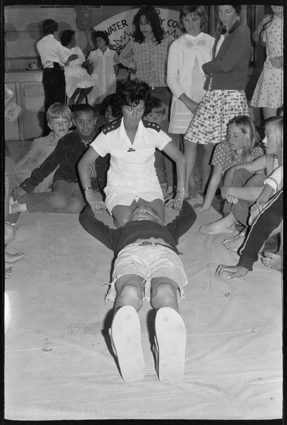 Date20 December 1974Reference Numberphoto gcc-31318DescriptionKerry Morris, 13, has instruction in the Silvester-Broche method of resuscitation from Mrs Davies. Published 20 December 1974.FormatNegativePhysical Description35mm black-and-white negative (4/5)Photographer/CreatorBay of Plenty Times