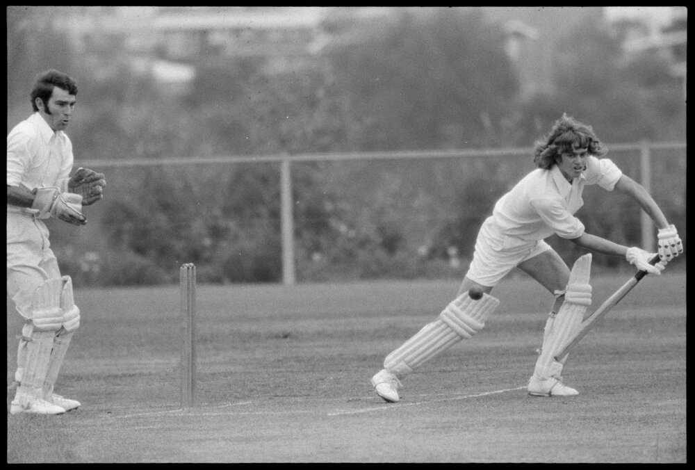 Date23 December 1974Reference Numberphoto gcc-31340DescriptionTauranga Boys College batsman John Bowden (right) plays a ball during a Tauranga v Te Puke A-Grade club cricket match at the Tauranga Domain. Partly obscured at left is the Te Puke wicketkeeper Brian Budd, and fielding at silly point is Dave Richardson. Published 23 December 1974.FormatNegativePhysical Description35mm black-and-white negative (1/3)Photographer/CreatorBay of Plenty Times