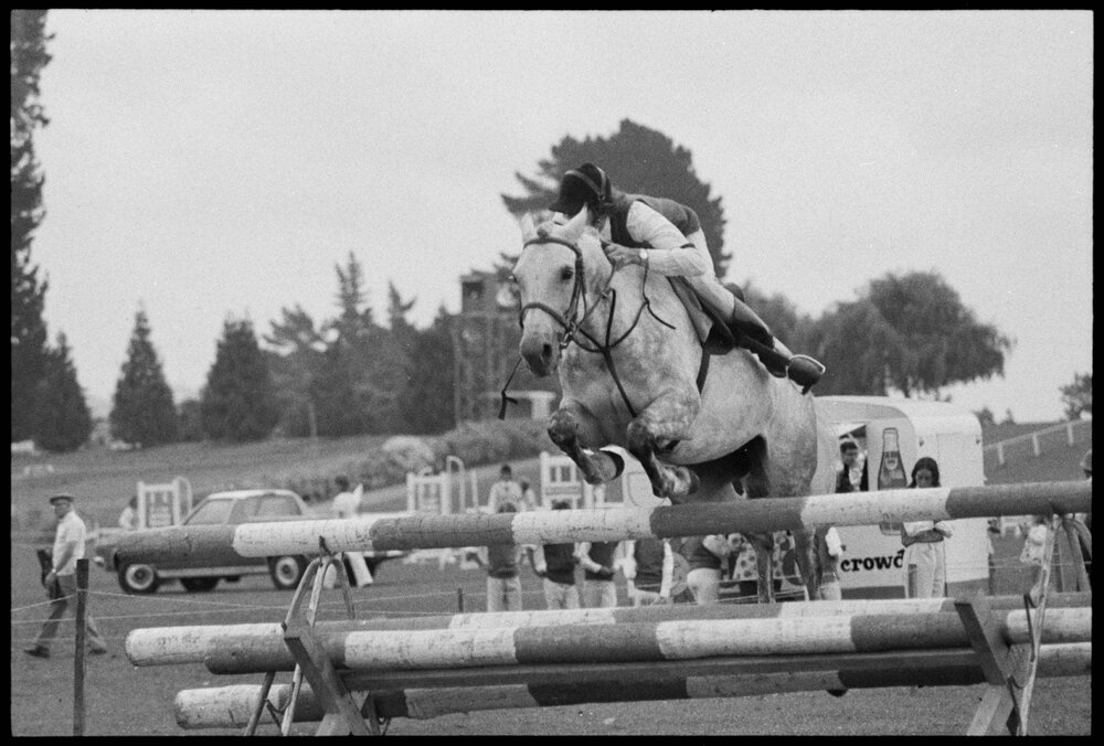 Date23 December 1974Reference Numberphoto gcc-31349DescriptionA rider competes in the 12-to-Under-14 years jumping event in the Auckland Provincial Pony Clubs Rider Championship. Published 23 December 1974.FormatNegativePhysical Description35mm black-and-white negative (4/15)Photographer/CreatorBay of Plenty Times