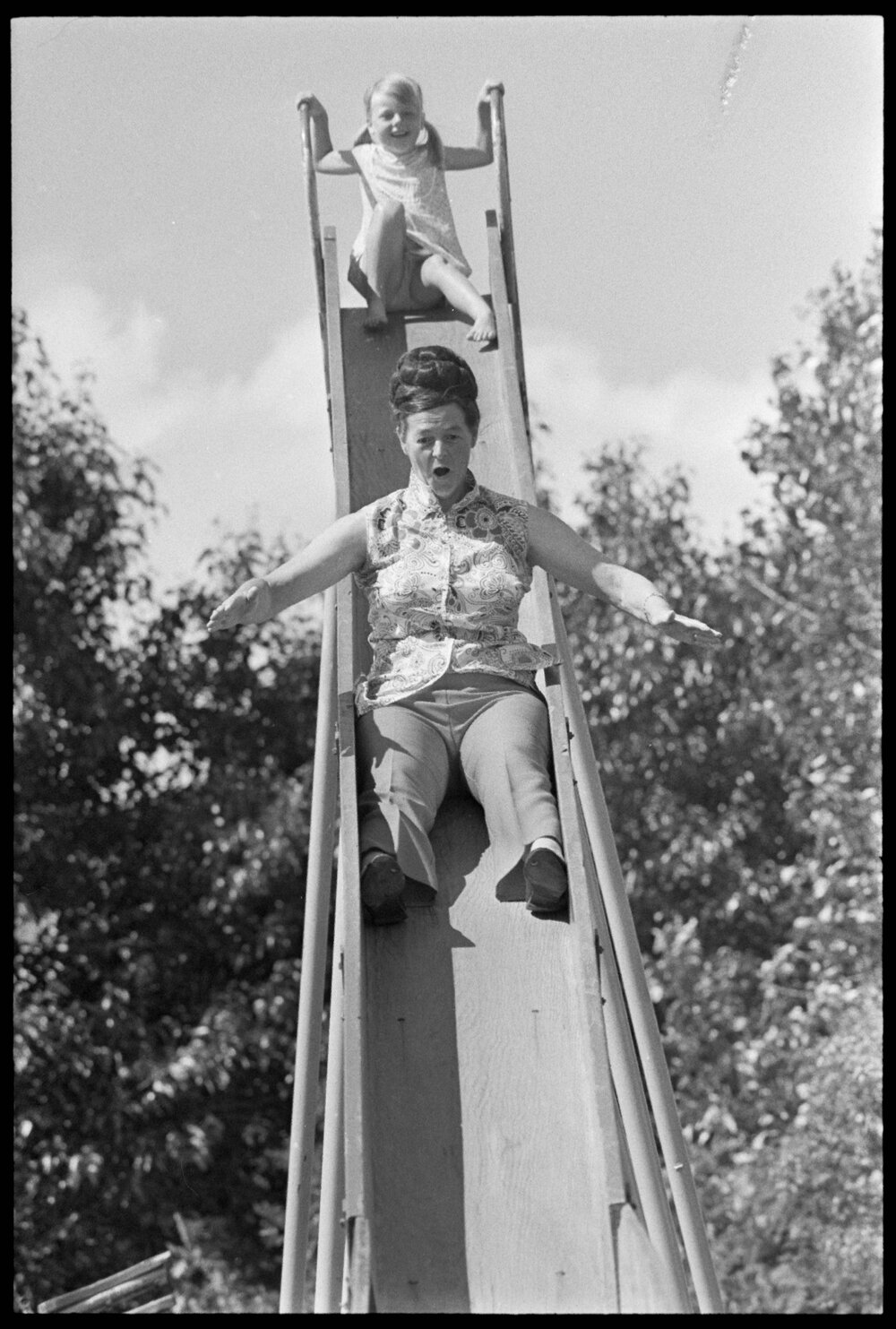 Date23 December 1974Reference Numberphoto gcc-31368DescriptionShooting down the Katikati slide is Dr Milan Brych crusader Mrs Hazel McNeill. Every evening at 8 o'clock she is at the children's playground in Main Street ready to descend on the slide for anyone willing to make a donation toward the cost of bringing witnesses from Czechoslovakia to testify to Dr. Brych's qualifications. Published 23 December 1974.FormatNegativePhysical Description35mm black-and-white negative (5/7)Photographer/CreatorBay of Plenty Times