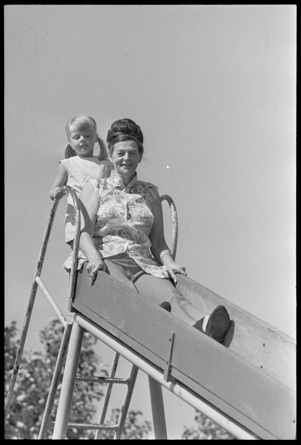 Date23 December 1974Reference Numberphoto gcc-31369DescriptionShooting down the Katikati slide is Dr Milan Brych crusader Mrs Hazel McNeill. Every evening at 8 o'clock she is at the children's playground in Main Street ready to descend on the slide for anyone willing to make a donation toward the cost of bringing witnesses from Czechoslovakia to testify to Dr. Brych's qualifications. Published 23 December 1974.FormatNegativePhysical Description35mm black-and-white negative (6/7)Photographer/CreatorBay of Plenty Times