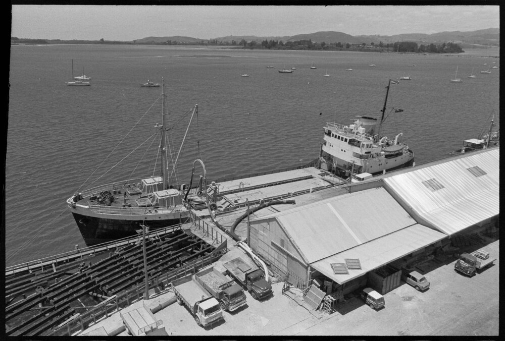 Date27 December 1974Reference Numberphoto gcc-31396DescriptionThe 1416 deadweight ton-bulk cement carrier Golden Bay visited Tauranga for the first time this week. She discharged cement at the Wilson (New Zealand Portland Cement Company depot - a job which is usually handled by the 4000 deadweight ton carrier Cement King. The Cement King has not been on the New Zealand coast for very long and she has fallen slightly behind schedule, said a spokesman for the company Mr J. W. Morrissey. The Golden Bay works out of Golden Bay in the South Island and she may make one more visit in a day or two, to help supplement the Cement King. Published 27 December 1974.FormatNegativePhysical Description35mm black-and-white negative (1/8)Photographer/CreatorBay of Plenty Times