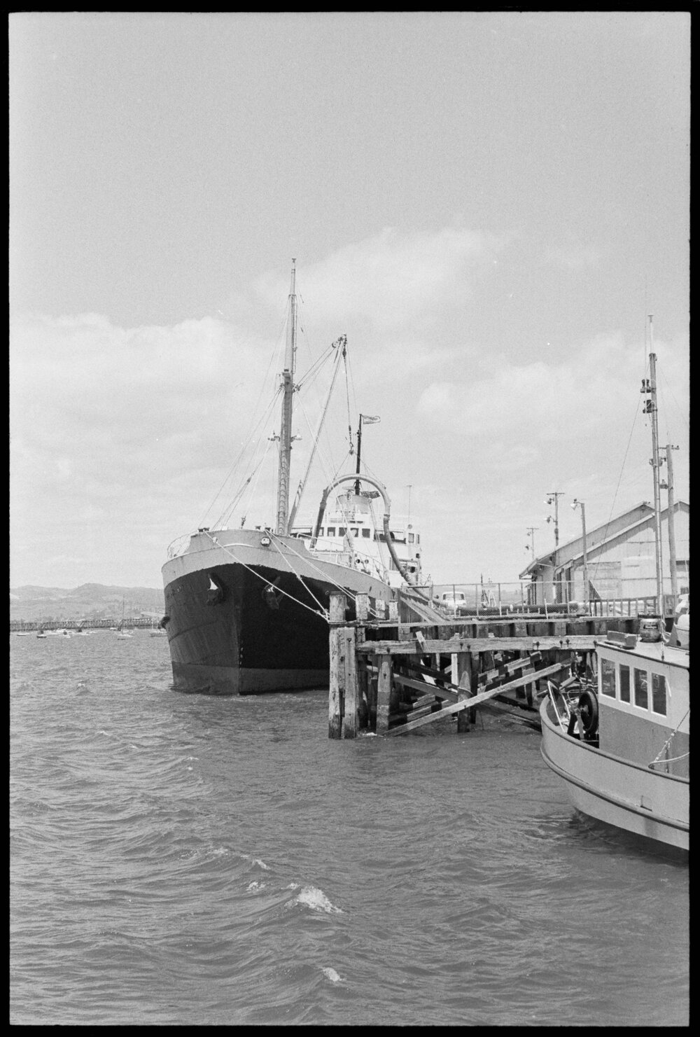 Date27 December 1974Reference Numberphoto gcc-31398DescriptionThe 1416 deadweight ton-bulk cement carrier Golden Bay visited Tauranga for the first time this week. She discharged cement at the Wilson (New Zealand Portland Cement Company depot - a job which is usually handled by the 4000 deadweight ton carrier Cement King. The Cement King has not been on the New Zealand coast for very long and she has fallen slightly behind schedule, said a spokesman for the company Mr J. W. Morrissey. The Golden Bay works out of Golden Bay in the South Island and she may make one more visit in a day or two, to help supplement the Cement King. Published 27 December 1974.FormatNegativePhysical Description35mm black-and-white negative (3/8)Photographer/CreatorBay of Plenty Times