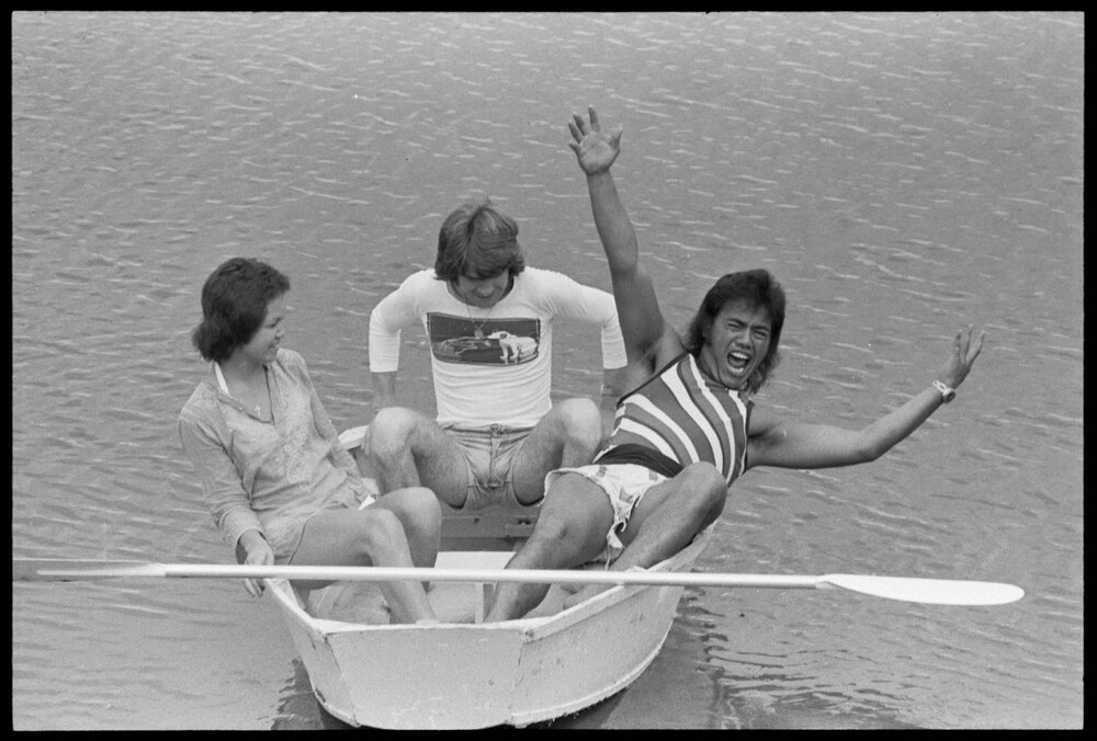Date27 December 1974Reference Numberphoto gcc-31404DescriptionLooking as if he is about to make a big splash in the entertainment world is singer Bunny Walters (right), who was singing, 'Don't Rock the Boat Baby' while out for a row on the Tauranga Harbour today. With him are fellow entertainers, Erana Clark and Craig Scott who performed at the Tauranga Soundshell the previous night. Published 27 December 1974.FormatNegativePhysical Description35mm black-and-white negative (1/9)Photographer/CreatorBay of Plenty Times