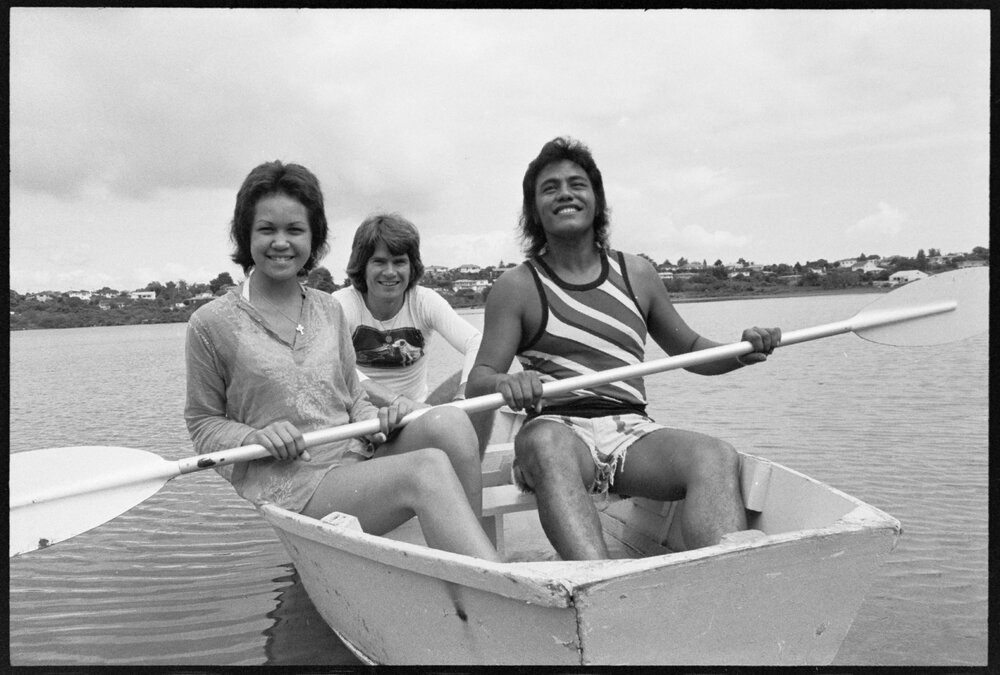 Date27 December 1974Reference Numberphoto gcc-31409DescriptionBunny Walters (right), who was singing, 'Don't Rock the Boat Baby' while out for a row on the Tauranga Harbour today. With him are fellow entertainers, Erana Clark and Craig Scott who performed at the Tauranga Soundshell the previous night. Published 27 December 1974.FormatNegativePhysical Description35mm black-and-white negative (6/9)Photographer/CreatorBay of Plenty Times