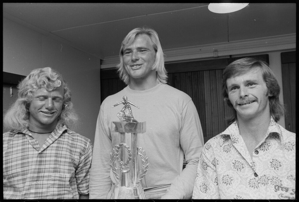 Date30 December 1974Reference Numberphoto gcc-31437DescriptionIan Cairns with the surfing trophy he won at the recent competition. Kevin Jarrett and Tony Waterhouse of Mount Maunganui were second and third. Published 30 December 1974.FormatNegativePhysical Description35mm black-and-white negative (1/7)Photographer/CreatorBay of Plenty Times