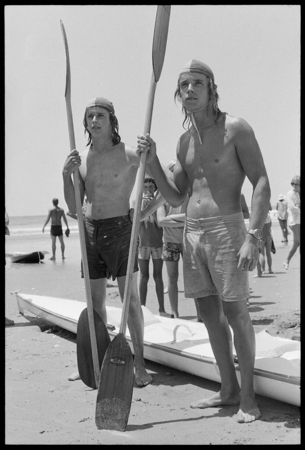 Date30 December 1974Reference Numberphoto gcc-31447DescriptionPhillip and Graeme Tonkin from Matamata, rest after paddling from Tūhua, Mayor Island to Waihī Beach on a two-man surf ski. They completed the 20-mile journey in just over three hours as part of a surf life-saving promotion campaign. Published 30 December 1974.FormatNegativePhysical Description35mm black-and-white negative (1/6)Photographer/CreatorBay of Plenty Times