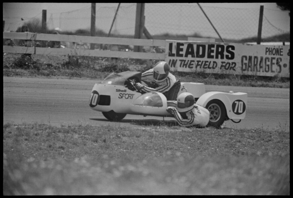 Date2 January 1975Reference Numberphoto gcc-31497DescriptionRiders in the first motorcycle sidecar race at Mount Maunganui’s Bay Park Raceway on New Year’s Eve. Published 2 January 1975.FormatNegativePhysical Description35mm black-and-white negative (1/27)Photographer/CreatorBay of Plenty Times