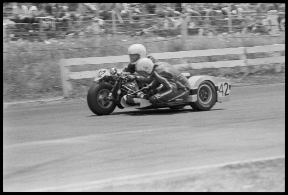 Date2 January 1975Reference Numberphoto gcc-31499DescriptionRiders in the first motorcycle sidecar race at Mount Maunganui’s Bay Park Raceway on New Year’s Eve. Published 2 January 1975.FormatNegativePhysical Description35mm black-and-white negative (3/27)Photographer/CreatorBay of Plenty Times