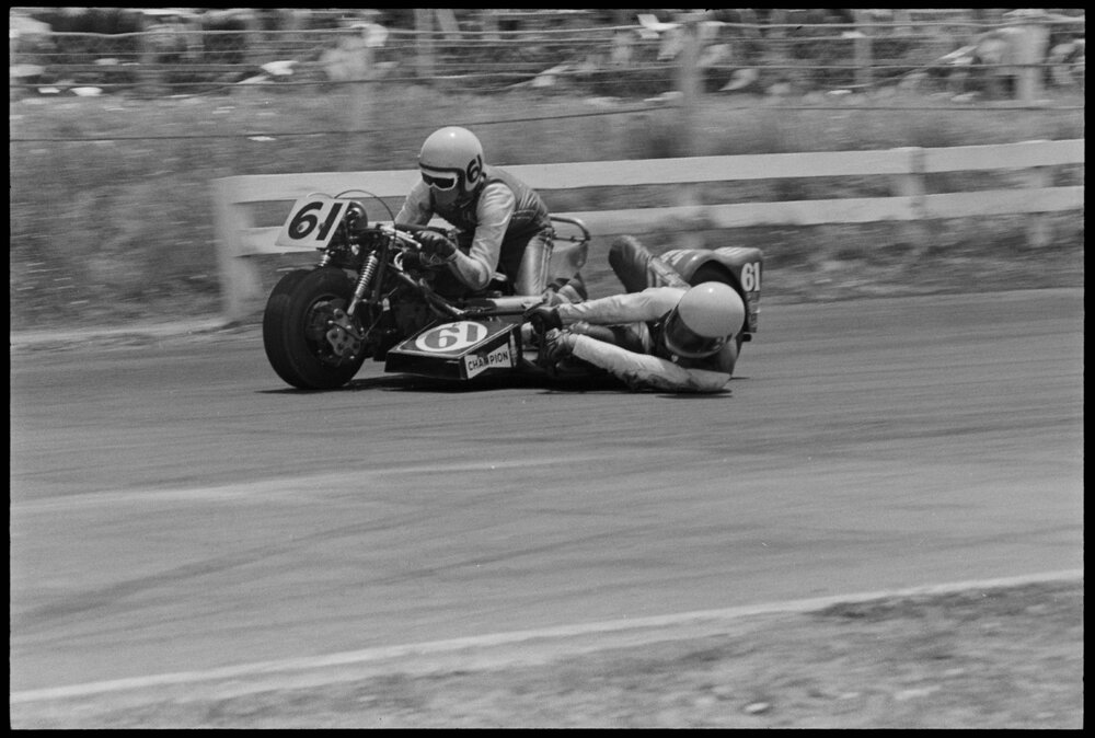 Date2 January 1975Reference Numberphoto gcc-31503DescriptionRiders in the first motorcycle sidecar race at Mount Maunganui’s Bay Park Raceway on New Year’s Eve. Published 2 January 1975.FormatNegativePhysical Description35mm black-and-white negative (7/27)Photographer/CreatorBay of Plenty Times