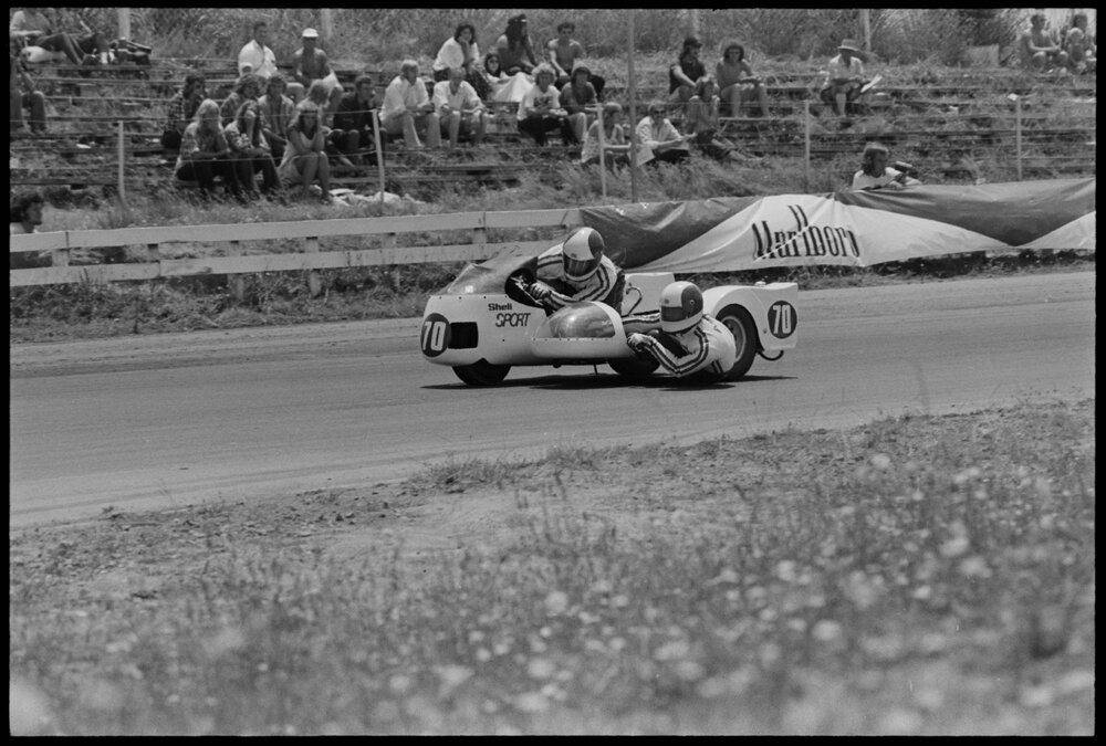 Date2 January 1975Reference Numberphoto gcc-31504DescriptionRiders in the first motorcycle sidecar race at Mount Maunganui’s Bay Park Raceway on New Year’s Eve. Published 2 January 1975.FormatNegativePhysical Description35mm black-and-white negative (8/27)Photographer/CreatorBay of Plenty Times