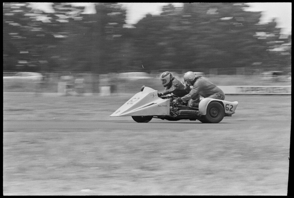 Date2 January 1975Reference Numberphoto gcc-31514DescriptionRiders in the first motorcycle sidecar race at Mount Maunganui’s Bay Park Raceway on New Year’s Eve. Published 2 January 1975.FormatNegativePhysical Description35mm black-and-white negative (18/27)Photographer/CreatorBay of Plenty Times