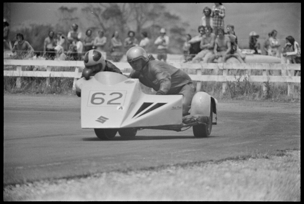 Date2 January 1975Reference Numberphoto gcc-31517DescriptionRiders in the first motorcycle sidecar race at Mount Maunganui’s Bay Park Raceway on New Year’s Eve. Published 2 January 1975.FormatNegativePhysical Description35mm black-and-white negative (21/27)Photographer/CreatorBay of Plenty Times