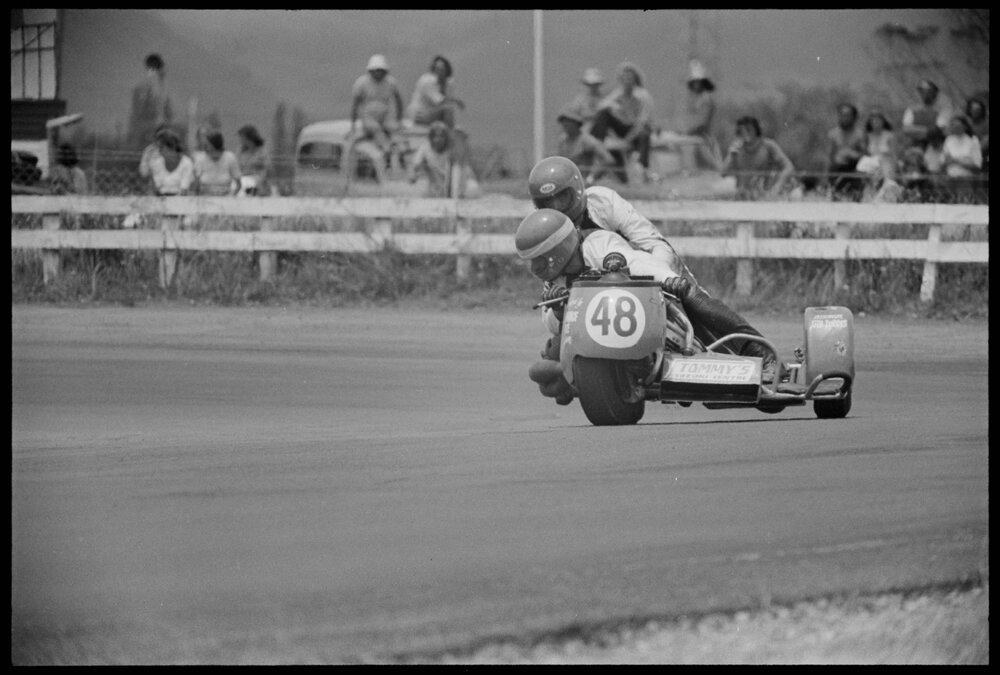 Date2 January 1975Reference Numberphoto gcc-31519DescriptionRiders in the first motorcycle sidecar race at Mount Maunganui’s Bay Park Raceway on New Year’s Eve. Published 2 January 1975.FormatNegativePhysical Description35mm black-and-white negative (23/27)Photographer/CreatorBay of Plenty Times