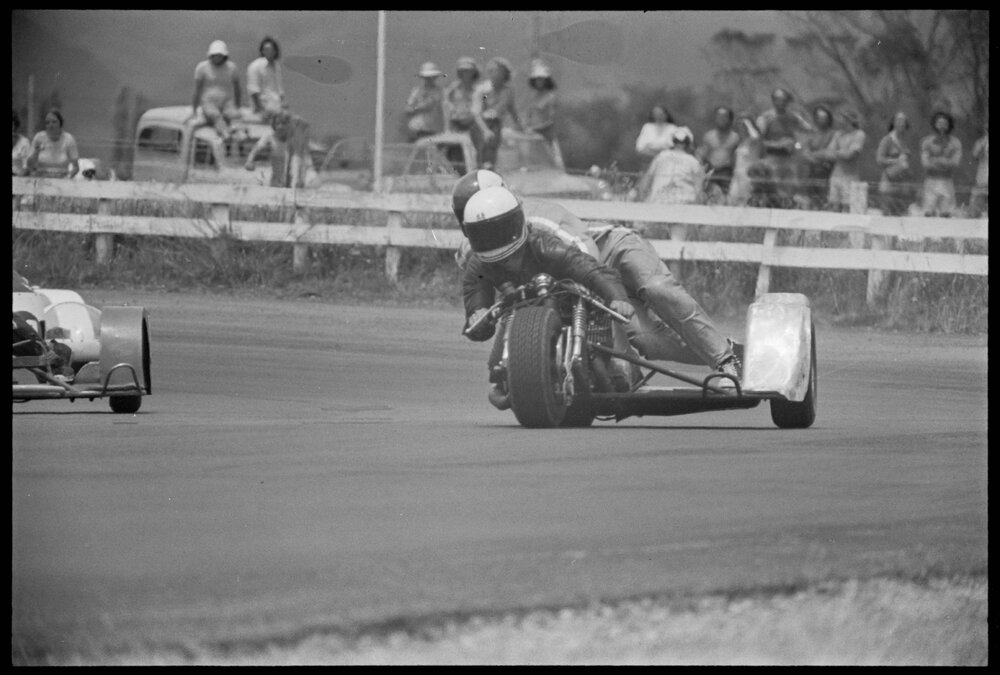 Date2 January 1975Reference Numberphoto gcc-31523DescriptionRiders in the first motorcycle sidecar race at Mount Maunganui’s Bay Park Raceway on New Year’s Eve. Published 2 January 1975.FormatNegativePhysical Description35mm black-and-white negative (27/27)Photographer/CreatorBay of Plenty Times