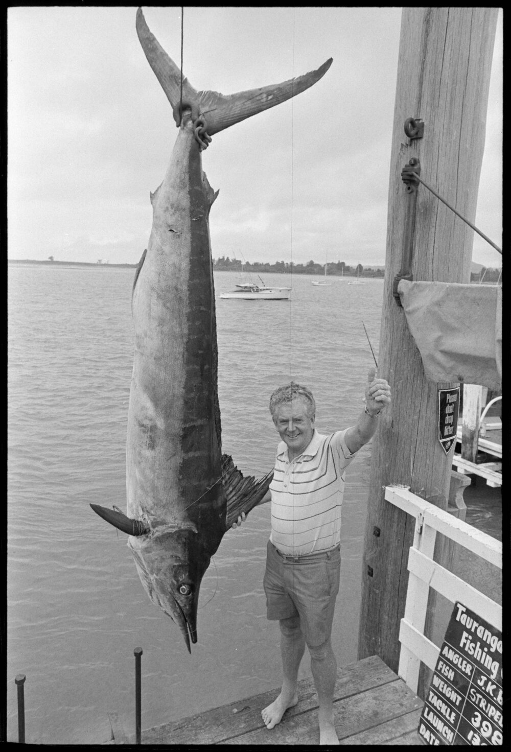 Date2 January 1975Reference Numberphoto gcc-31526DescriptionJohn Boyle, of Tauranga, who landed the 398 lb possible world record striped marlin hung at the Strand Reclamation, on 130 lb gear. A record claim for it will be lodged by the Tauranga Big Game Fishing Club. Published 2 January 1975.FormatNegativePhysical Description35mm black-and-white negative (3/14)Photographer/CreatorBay of Plenty Times