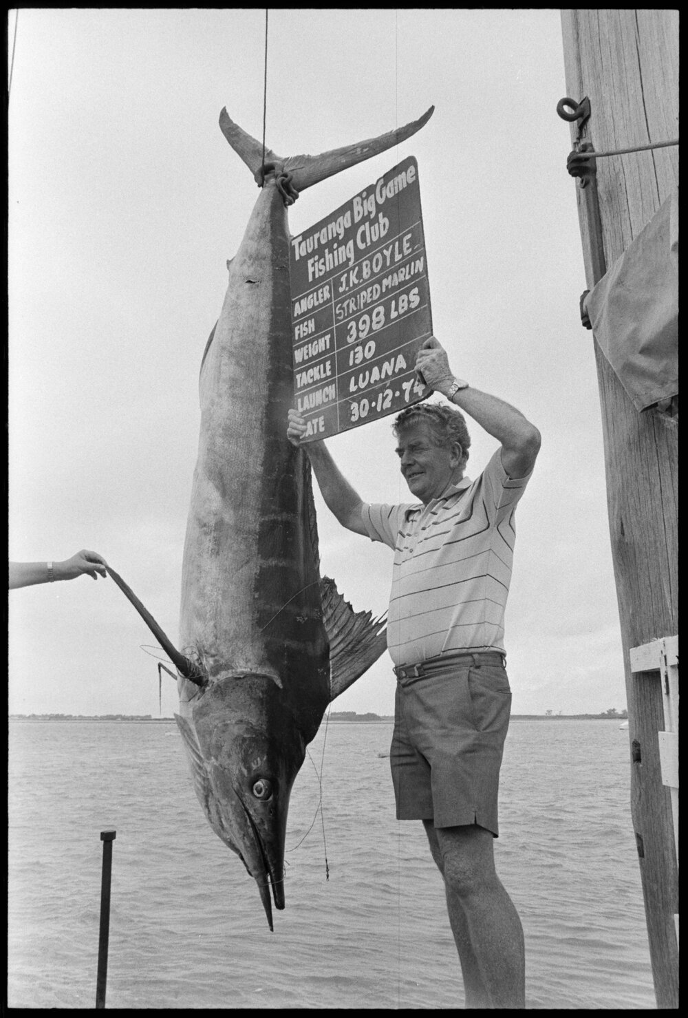 Date2 January 1975Reference Numberphoto gcc-31529DescriptionJohn Boyle, of Tauranga, who landed the 398 lb possible world record striped marlin hung at the Strand Reclamation, on 130 lb gear. A record claim for it will be lodged by the Tauranga Big Game Fishing Club. Published 2 January 1975.FormatNegativePhysical Description35mm black-and-white negative (6/14)Photographer/CreatorBay of Plenty Times